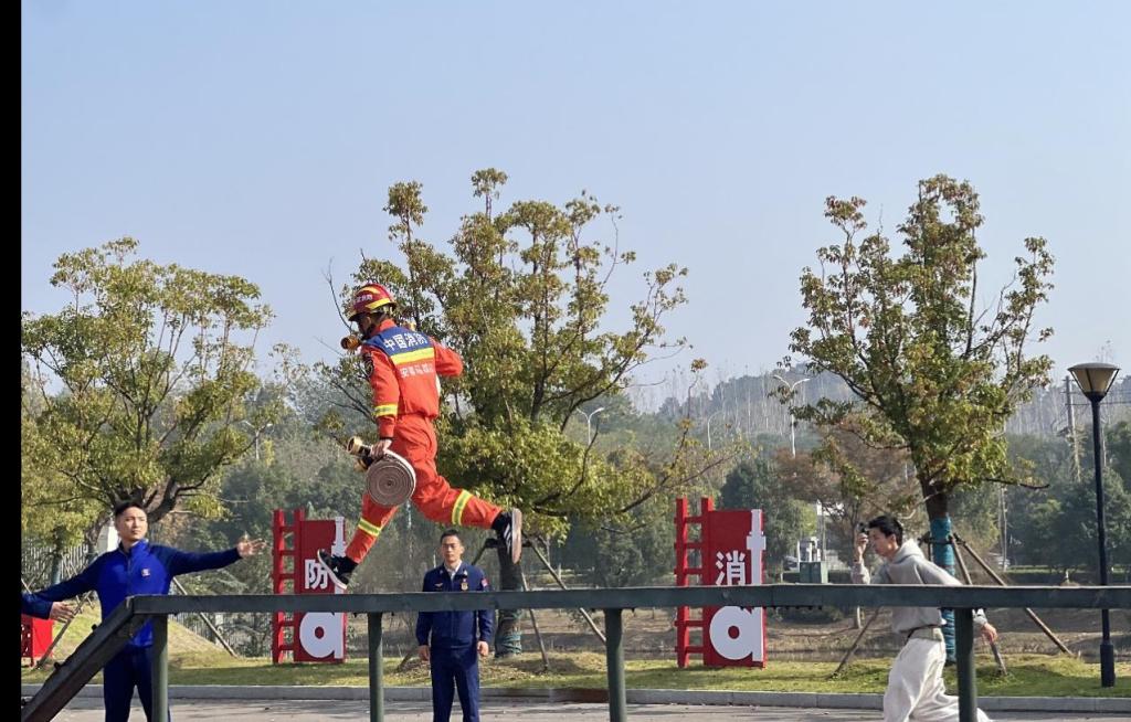 活动中,消防员代表围绕“全民消防,生命至上”主题,就宿舍安全用电、实验室灭火器使用等校园常见隐患进行了专项讲解;结合高空救援,消防员们展示了绳索攀爬、挂钩梯攀登等日常训练项目,精湛技艺瞬间点燃现场氛围,多名学子踊跃参与互动,亲身体验消防训练的强度与不易;最后,学生们有序参观了各类消防车辆与专业器材,详细了解其功能用途,并通过亲身穿戴厚重消防战斗服,切身感受了消防员所肩负的沉重责任与使命。