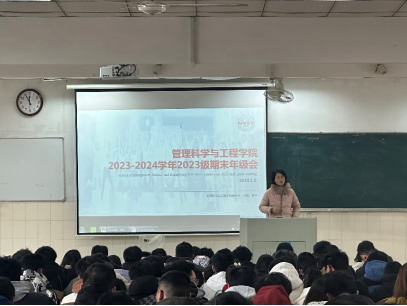 为进一步弘扬校风、培育学风、端正考风,树立学生诚信应考意识,做好寒假教育管理工作。管工学院于1月5日中午在阶教101开展2023级期末年级会,会议由2023级辅导员刘瑜、曹宇主持,2023级全体同学到场参加。