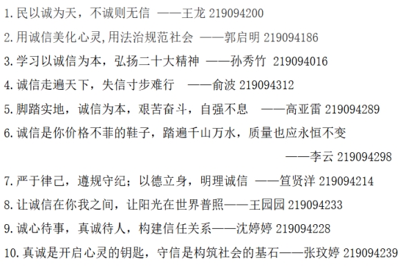 通过学院本次的诚信标语收集活动以丰富多样的形式强化了学院学生的诚信知识和诚信意识,也为学院学生品德修养、能力发展提供了实践锻炼、展示自我的平台。诚者,天之道也;思诚者,人之道也。相信伟德betvlctor1946源于英国的学子们将在以后的成长中秉持诚信准则,积极践行“诚信立身,秉信立行”精神,努力炼就合格新时代青年的诚信品质。