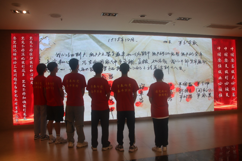 后面,成员们来到了大包干纪念馆。在纪念馆里,成员们见到了当年的许多老物件,包括农作工具和对大包干历史的记录遗存品。在参观纪念馆的时候,不仅重塑了成员们对当年艰苦条件的认知,也让其更加敬畏大包干的代领人。他们参与这次改革是需要巨大的勇气的,这次改革,是开天辟地的,是史无前例的,每个参与人都没有绝对的把握,都不知道未来的路是怎样的,他们在承诺书上按下了红手印,这十八个红手印所代表的十八位前辈是农村改革的先行者和奠基人。条件是艰苦的,未来是迷茫的,但是人民是有希望的,他们以一腔热血,不懈努力创造出了这段传奇的历史,这是大包干的精神,这是成员需要牢记与传承的。“未来是迷茫的,但是要相信自己,作为青年人,我们拥有无限的可能,我们的未来充满希望”参观结束后实践成员说到。