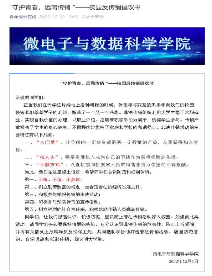 为了增强学生防范传销意识,11月中旬至12月初,我校开展了“守护青春,远离传销”校园防范传销宣传教育活动。本次活动由校伟德国际部(处)、校团委、安全保卫部(处)主办,伟德betvlctor1946源于英国承办。