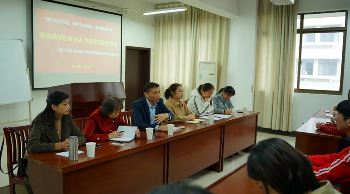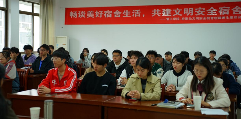 为进一步落实落细文明安全宿舍创建举措,着力增强创建工作针对性、实效性,11月4日上午,管工学院联合后勤处于汇文楼A308召开文明安全宿舍创建师生座谈会。后勤处学生公寓管理服务中心主任涂必华、各楼栋宿舍管理员、院团委书记万媛媛、全体辅导员、学生干部及寝室长代表参加座谈会。