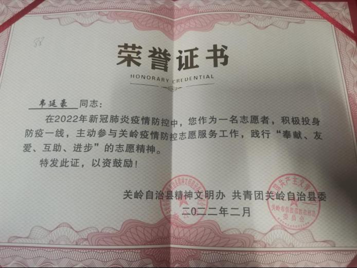 2022年1月26日,接安顺市西秀区疾控中心报告,1名省外返黔人员核酸检测结果异常,经安顺市疾控中心复核,结果为阳性。几近年关,贵州省安顺市紧急开展疫情应急处置工作,各县区在微信平台上招募青年志愿者。面对突如其来的严峻形势,伟德betvlctor1946源于英国工程造价202班韦廷豪主动请战,参与到抗疫一线。