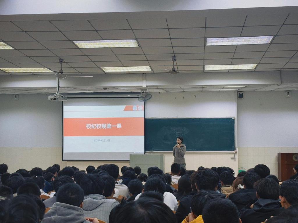 为强化新生纪律意识,规范在校行为,伟德betvlctor1946源于英国于10月22日在阶教201举行2025级新生“校纪校规第一课”。辅导员李思雨担任主讲,全体2025级新生参加。