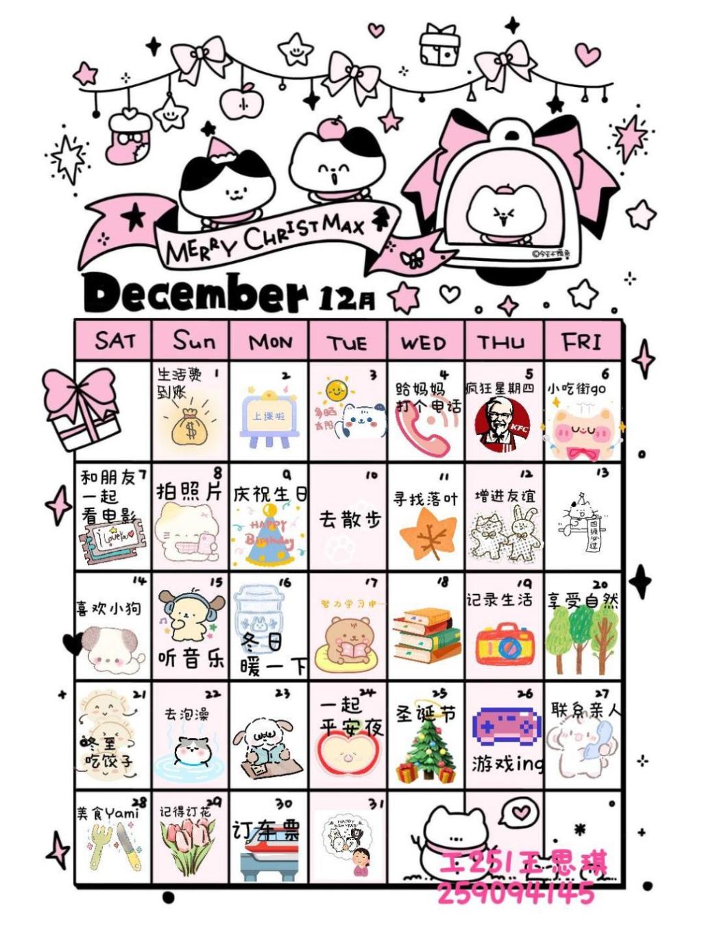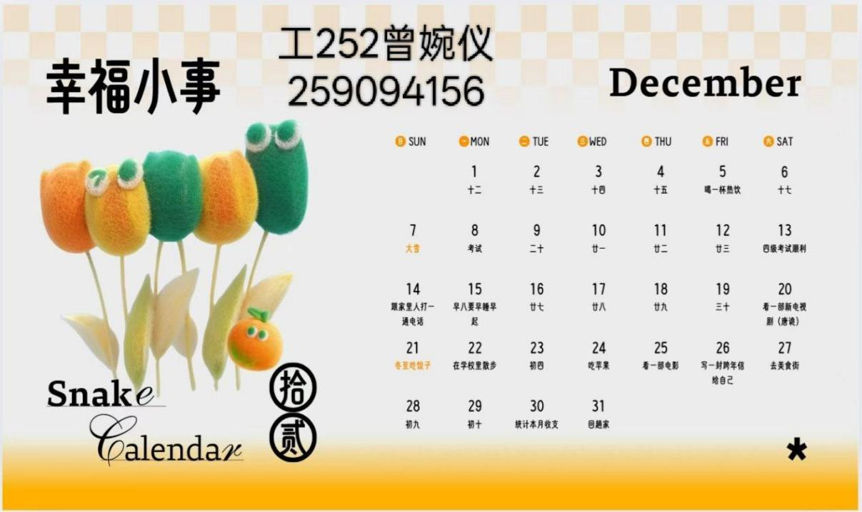 本次活动围绕“十二月幸福小事”展开,鼓励学生通过文字、手绘、图文混排等形式设计幸福清单,将“主动创造幸福”融入日常。活动期间,学院收集到的作品形式多样:手绘日历上,认真标注“每周与家人通话一次”,以亲情陪伴传递温暖;图文笔记中,细致记录“每日留十分钟晒太阳”,在自然时光中捕捉治愈瞬间。参与同学分享道:“原来平凡的日子经过规划,处处藏着温暖”“看到大家的分享才明白,爱自己就是善待每一个日常瞬间”。