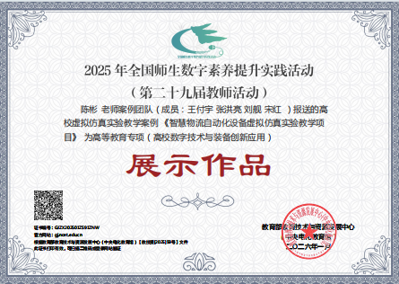 近日,由教育部教育技术与资源发展中心组织开展的“2025年全国师生数字素养提升实践活动”评审结果揭晓。我院实验中心申报的虚拟仿真实验教学案例《智慧物流自动化设备虚拟仿真实验教学项目》(负责人:陈彬,成员:王付宇、张洪亮、刘舰、宋红)成功入选,并被列为“高等教育专项(高校数字技术与装备创新应用)”展示作品。