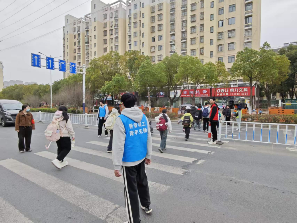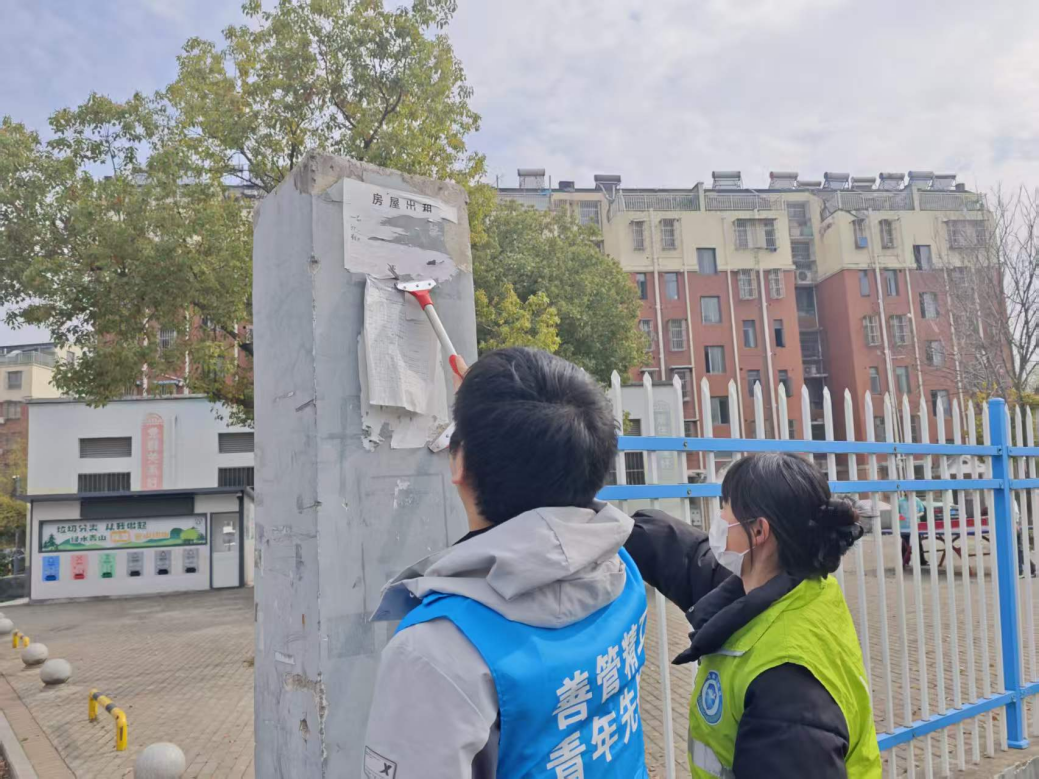 活动中,志愿者们分工协作、配合有序,各项服务稳步推进。面对社区墙壁上杂乱的贴纸和小广告,他们手持铲子、喷壶、抹布等工具,逐一耐心清理,并仔细擦除残留痕迹,确保不留死角,切实改善社区环境。在社区人行路口,志愿者们化身“爱心护行员”,密切关注路况,主动引导交通,耐心提醒小朋友“注意来往车辆”“快速通过斑马线”,同时协助家长对接孩子,减少道路停留时间,为社区出行筑起一道安全屏障。