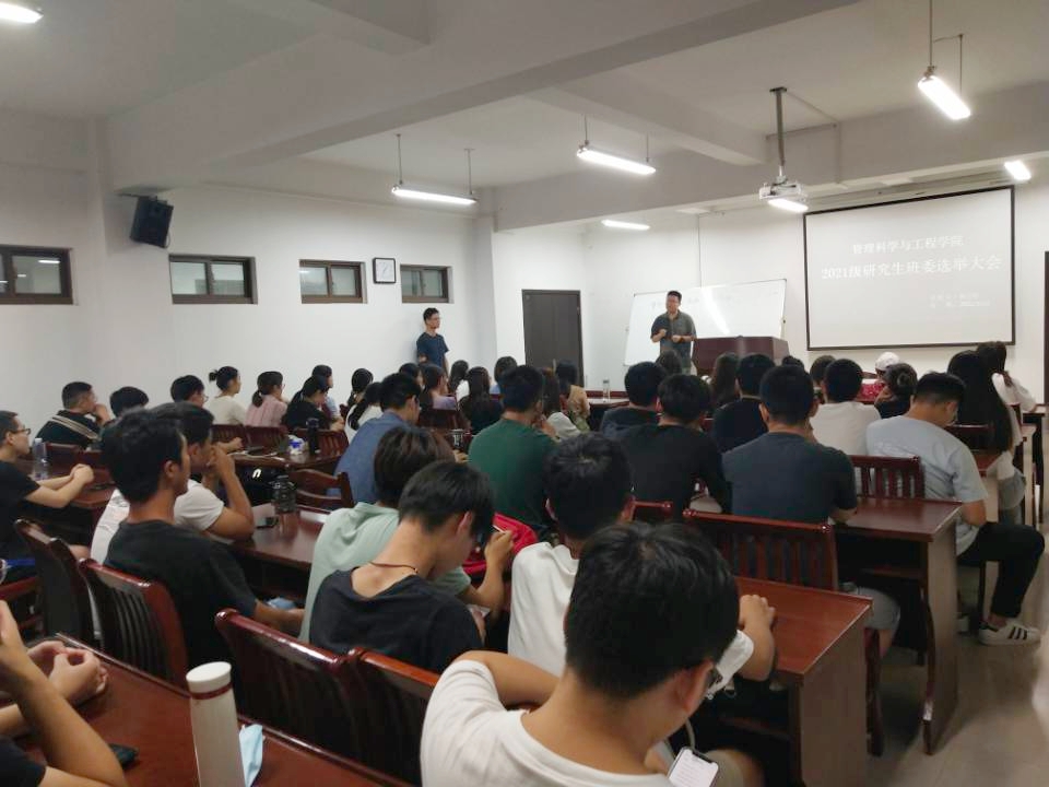 9月23日晚,管工学院在汇文楼A308召开2021级研究生班委选举大会,全体2021级研究生到会,20级班级负责人操礼春主持会议。