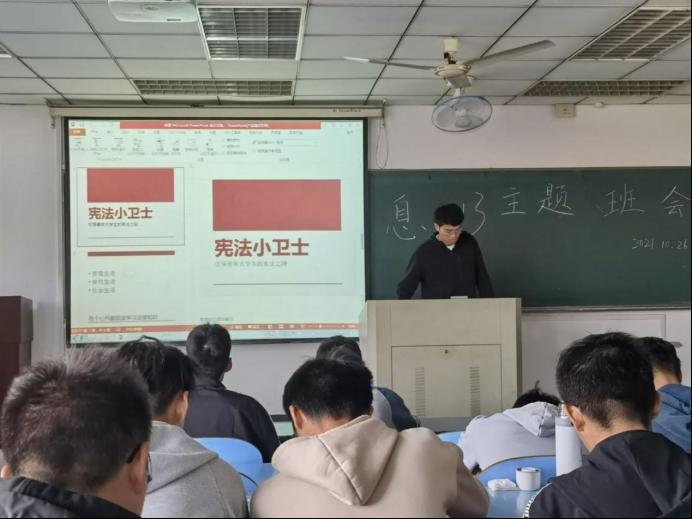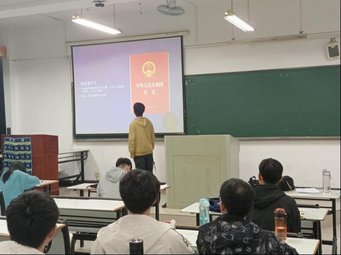 班级宣讲人以PPT的形式向同学们讲解了宪法的基本知识,包括了宪法的含义、发展历程、内容以及与公民日常生活的联系等内容。他们以案说法向学生们普及了作为青年学生应该如何保护自己的合法权益、如何预防违法犯罪、青少年违法犯罪的原因等基本法律知识。活动最后,宣讲人邀请了部分同学讲法说法,积极讨论,帮助同学们更好的领会了宪法精神。“今后我一定认真学习宪法知识,将带头宣传宪法、维护宪法权威,做尊法学法守法用法的模范。”一位同学在参与活动后如是说。