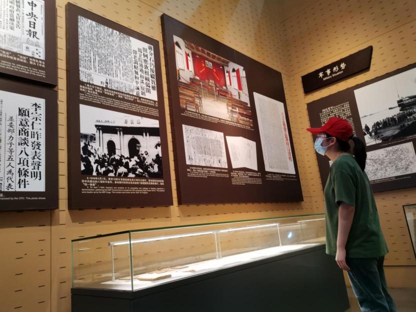 图为实践队员观览毛泽东发表的对时局声明、《将革命进行到底》文章等文献照片了解当时的政治形势。
