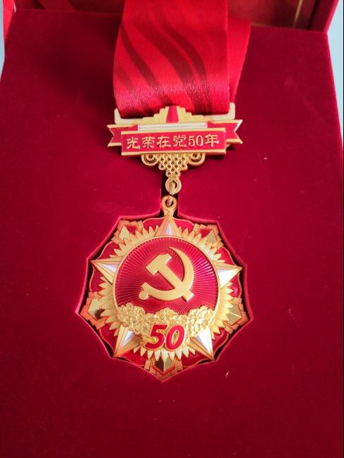 图为老党员马志美的在党五十年纪念徽章。