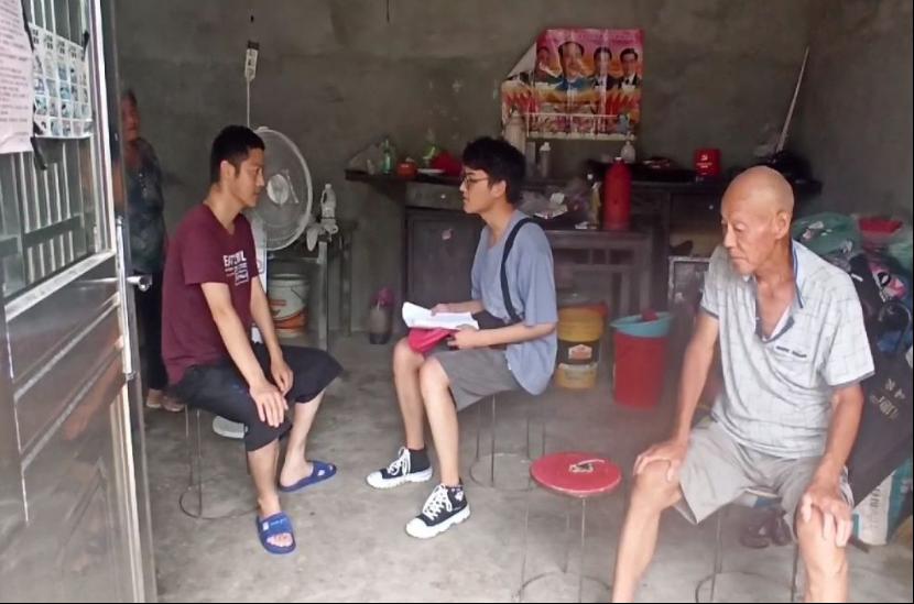 图为实践队员在于江从哉老人长子交谈。