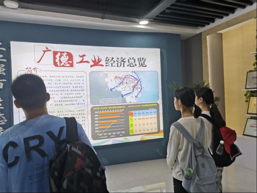 图为工作人员为实践队员介绍广德发展所取得的荣誉。