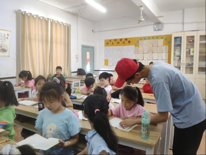 图为学院赴池州党史宣讲团队队员陈磊在安徽省池州市青少年活动中心宣讲党史时为小朋友们答疑解惑。