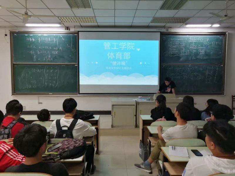 会上,各班级体育委员结合PPT展示,分别从体育与健康、体育活动安全事项等方面做了详细介绍。着重强调了要将“安全第一、健康第一”的指导思想放在首位;同时讲述了体育与生活的联系,鼓励同学们要“走下网络,走出寝室,走进操场”,在加强体能锻炼的同时学会自我保护,切实做到“阳光体育,快乐运动,健康成长”。