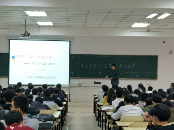 10月23日下午,我院在本部教三南103举办以“调整自我,从容生活”为主题的大学生入学适应教育讲座。校学工部副部长、大学生心理健康教育咨询中心主任王军主讲,我院全体新生到场参加。