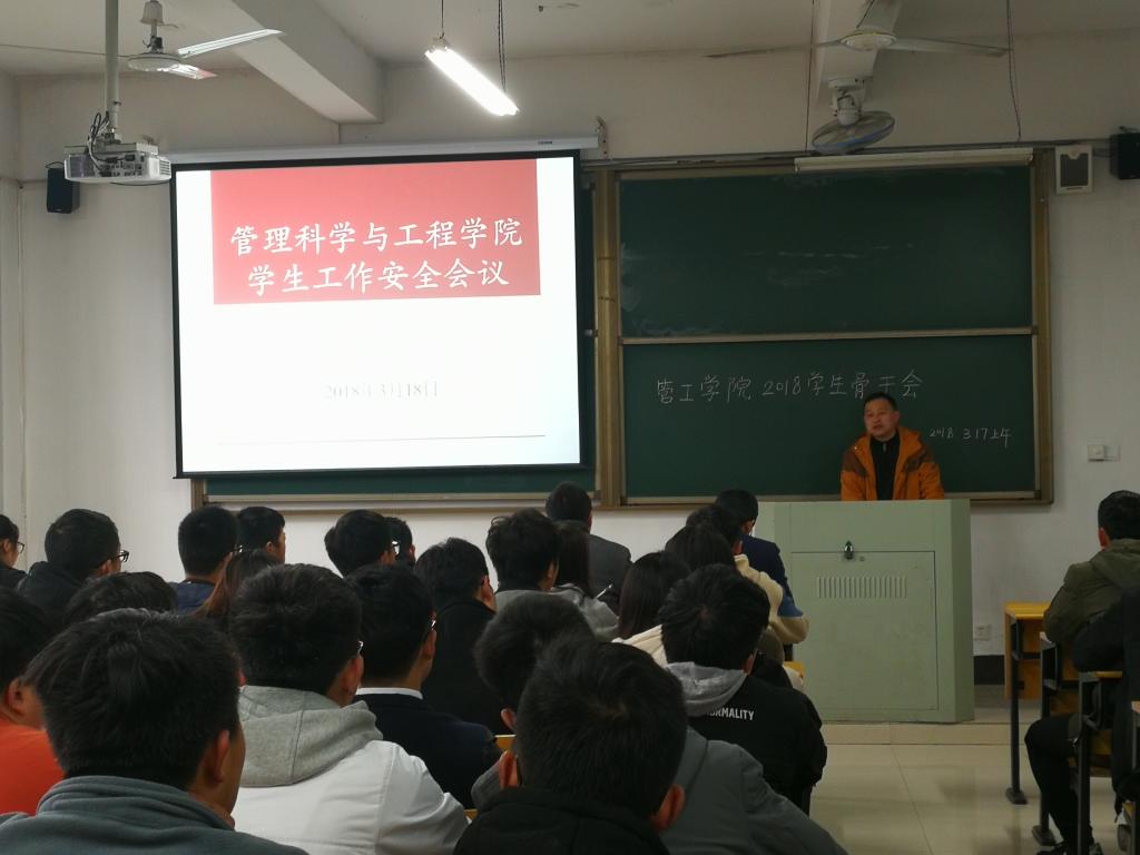 3月18日上午,管工学院在教D102召开了2018年学生安全稳定工作落实会。院党委副书记汪春胜出席了会议,各年级辅导员、学生骨干、学生信息员参加了会议,院团委书记周爱军主持会议。